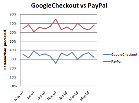 I wrote back into December 2007 that 70% of my customers prefer PayPal over GoogleCheckout, given the choice. I re-checked the figures today to see if GoogleCheckout was gaining traction with my customers. It isn’t.