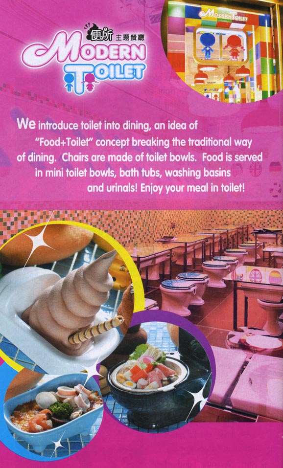 That’s right. A toilet themed restaurant where “Food is served in mini toilet bowls” and the dessert looks like a, well, see for yourself. The ad was in a tourist brochure and they have a website, so it appears to really exist.