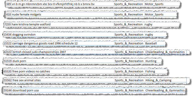 Did they do any QA on this list[1]? Exactly how many people are searching on “vn b m gn mbnmncbm xbc bcv 0 vfkmjirhtfnkj nb b x bmnx bv”? What has dogging (not work safe) or Hare Krishna got to do with rugby? Is it any wonder nobody is bidding on “duck porn”? Are there really that many people interested in pictures of nude female bodybuilders (apparently)?