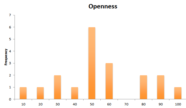 We are about average for openness. But the scores are clumped around the centre. Initially I was a bit surprised by this result. I expected bootstrappers to be inventive/ideas people and to score well above average. But perhaps the people who score very highly on openness are easily distracted (squirrel!), and never get anything finished.