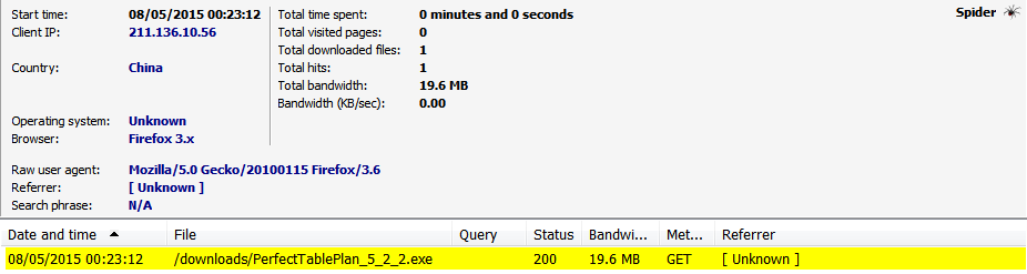 A spider (probably not Chinese)It’s a good to idea to regularly look through the logs of your website. You’ll often find something interesting. In March 2013 I was looking through the web logs for my seating planner software and I noticed the number of downloads of the Windows version of my software had gone up by a factor of 5, compared to the previous month. Everything else stayed pretty much the same: