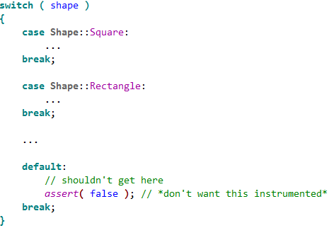 • It is now possible to mark sections of code not to be instrumented. I haven’t had time to try this yet, as it was only introduced in v3.0.4. But it should be very useful as currently I have a lot of defensive code that should never be reached (see below). Instrumenting this code skews the coverage stats and makes it harder to spot lines that should have been executed, but weren’t.