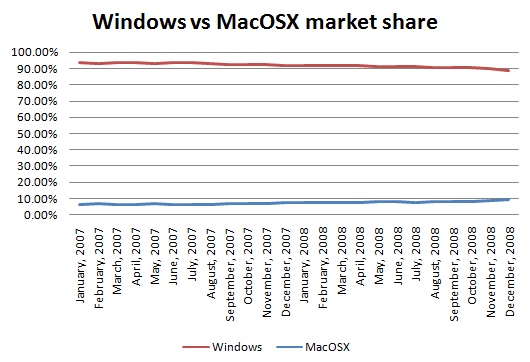 Windows market share fell from 91.79% to 88.68% in the same time. While Mac OS X’s annual gains are impressive, it has a long way to go to catch Windows. 15 years if you project the 2008 gains forward.