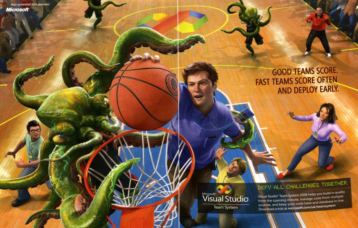 I am still struggling to understand the underlying message. Use Team System and Microsoft will get its tentacles around you? I don’t know which is more unlikely, the basketball playing Cthonians or the athletic and good looking development team.