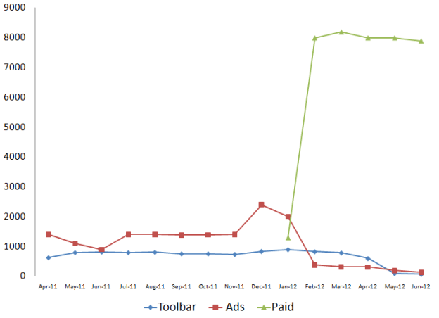 I believe that the best way for most small software vendors to make money off their software is to charge for it. So I was interested to spot a post on BOS by someone who had tried ads, toolbars and charging to monetize the same piece of software. He kindly agreed to share his experience anonymously. Obviously it is only one data point, but the results are pretty unequivocal.