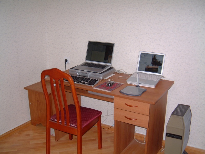 For six months, we tried to manage our software business while teaching English and doing odd jobs for NGOs, newspapers and radio stations. We had brought with us two Mac laptops (a PowerBook G4 and an iBook G3), which were both maxed out as far as hard drive and memory were concerned, an extra battery for the G4, an external keyboard, a digital camera, and various cables and worldwide plug adaptors. We had also brought a CD case full of original software discs.
