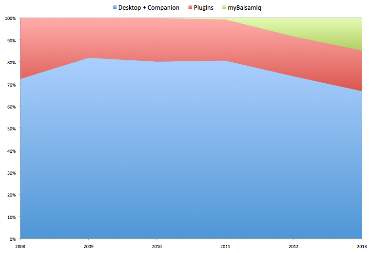If I look through the list of useful tools and services on this site I see that 51 of them are web-based and 35 are desktop based. Peldi of Balsamiq reported in 2009 that 77% of their revenue comes from the desktop versions of their software. I asked him if that had changed much and he was kind enough to send me the following graph (myBalsamiq is the web version). You can see that it is still nearly 70% 4 years later.